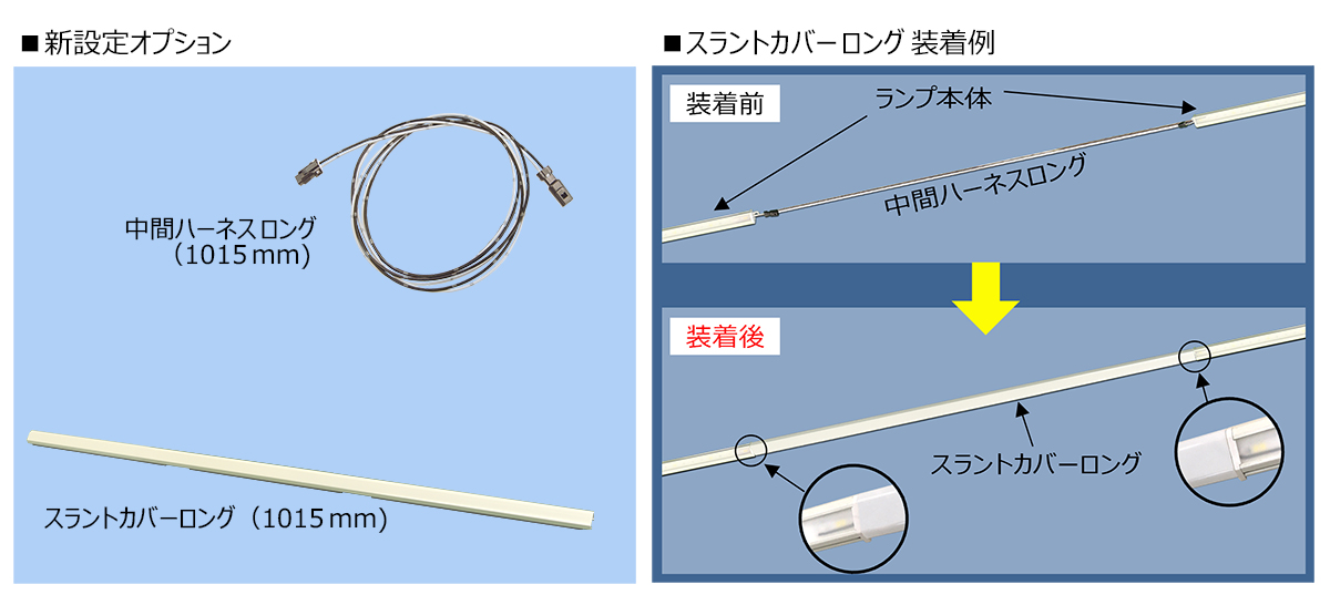 ご好評いただいております 「LEDラインライト スラントタイプ」の新しいラインナップとして、「スラントショート(ハーネス右側/両側)」、オプションとして「中間ハーネスロング」「スラントカバーロング」を追加しました。