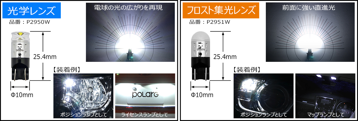 ご好評いただいております「自動車用 ポラーグLEDバルブ」のラインナップに「T10ウェッジタイプ」の新商品を追加いたしました。