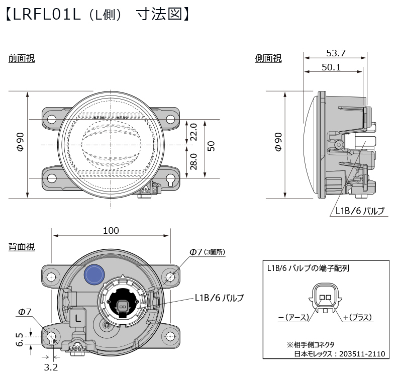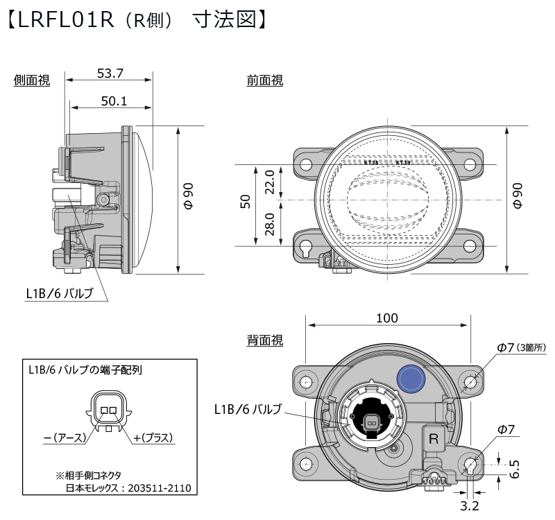 | LRFL01R | 1 | 12V 4W | L1B/6バルブ (白色LED 1灯) | 123 | オープン | 202388 | 右側に広がる配光※ |