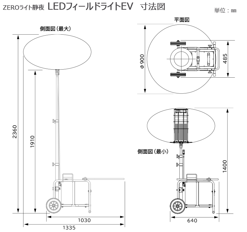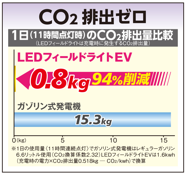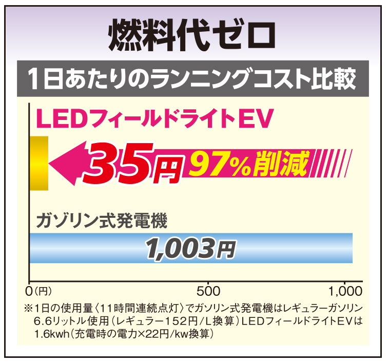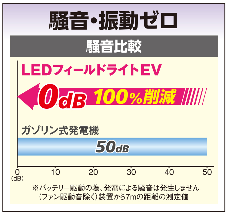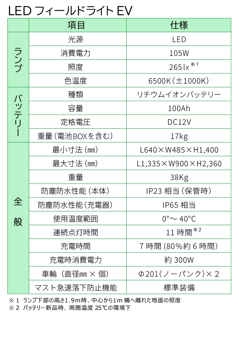 | LEDフィールドライトEV | ZLS-12LFS-EV | LED | 265 lx | 105W | 11時間 | 38kg | オープン | 一式 | 021474 | ・ランプ ・架台 ・バッテリー ・充電器 |