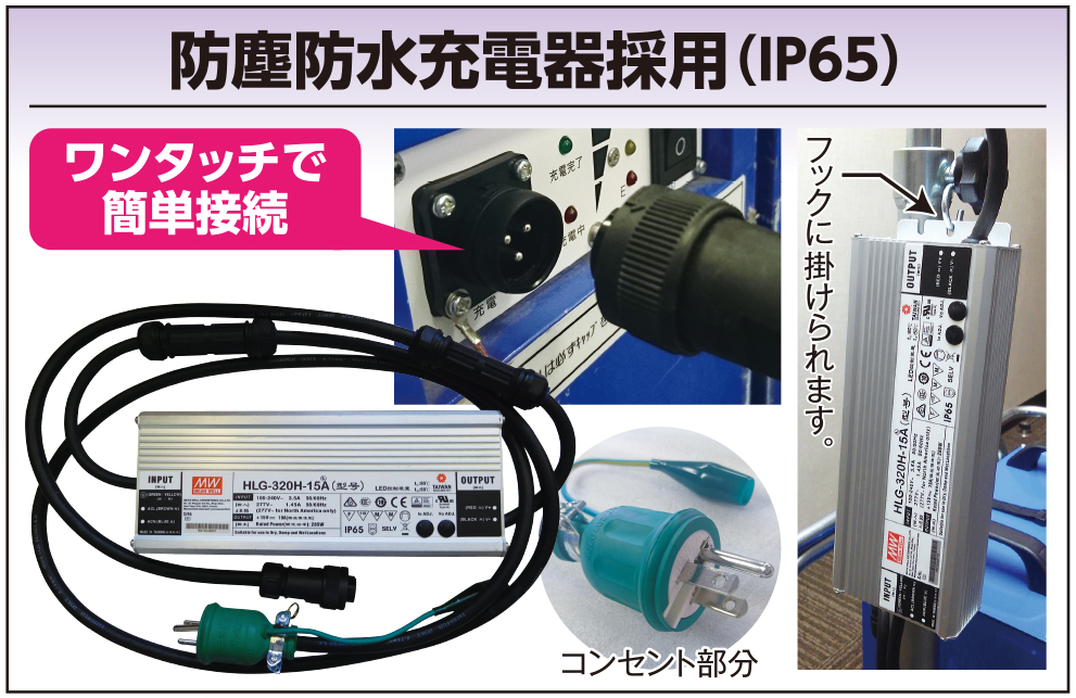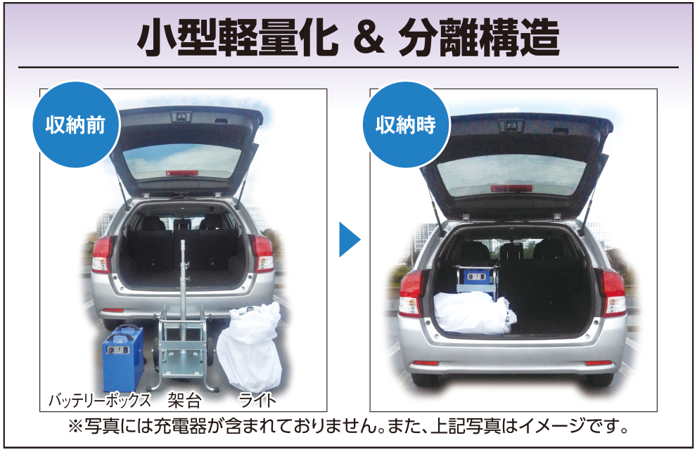 リチウムイオンバッテリー・LEDランプ・小型架台の組み合わせにより、ユニック等を使用せず、女性でも楽に操作できる総重量38kgを実現しました。